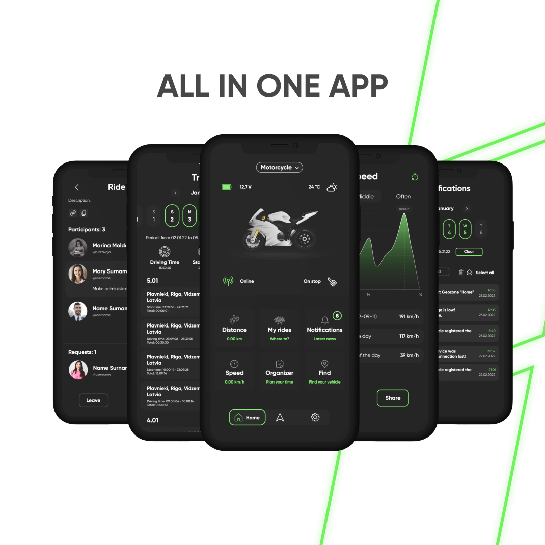 - Geozonen (virtuelle Zonen, um Benachrichtigungen über Eintreten/Verlassen des Fahrzeugs in diese zu erhalten)